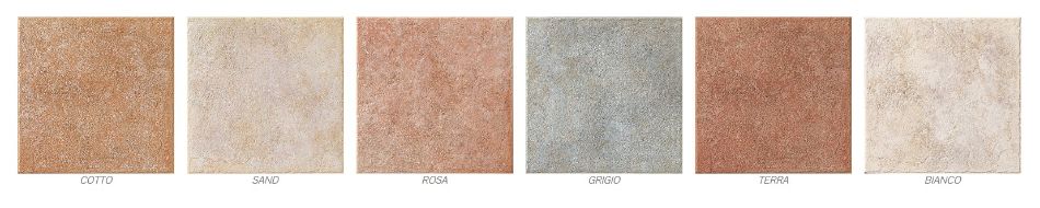 Kolekcija je dostupna u bojama Cotto, Sand, Rosa, Grigio, Terra i Bianco, u formatima 30x30 cm, 15x30 cm i 15x15 cm, sa Naturale (NRT – non rettificato) završnom obradom. Protivkliznost R10 omogućava primenu na podovima u enterijerima i spoljašnjim prostorima.
