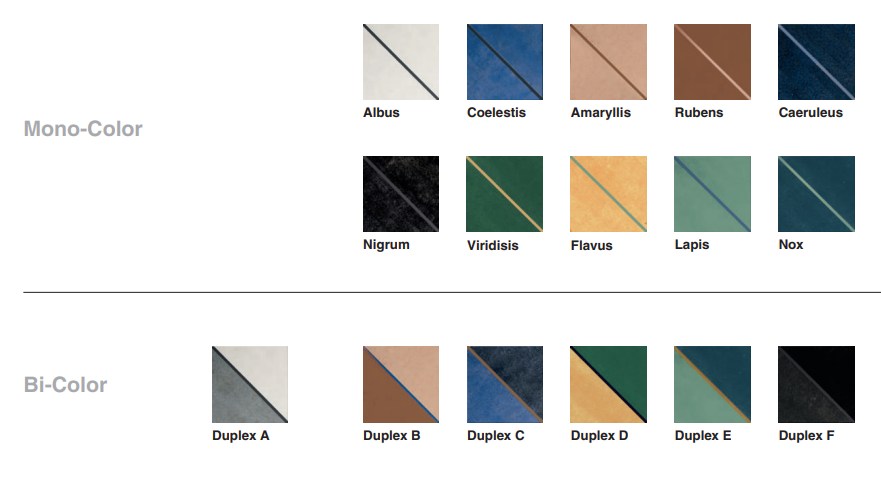 Kolekcija obuhvata Mono-Color i Bi-Color varijante, sa nijansama Albus, Nigrum, Amaryllis, Rubens, Coelestis, Caeruleus, Flavus, Viridis, Lapis, Nox, Duplex A, Duplex B, Duplex C, Duplex D, Duplex E i Duplex F. Koncept je razvijen za maksimalnu fleksibilnost u projektovanju, uz mogućnost formiranja velikog broja različitih obrazaca na zidovima i podovima.