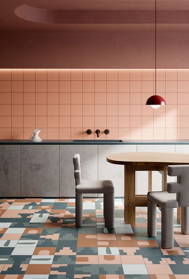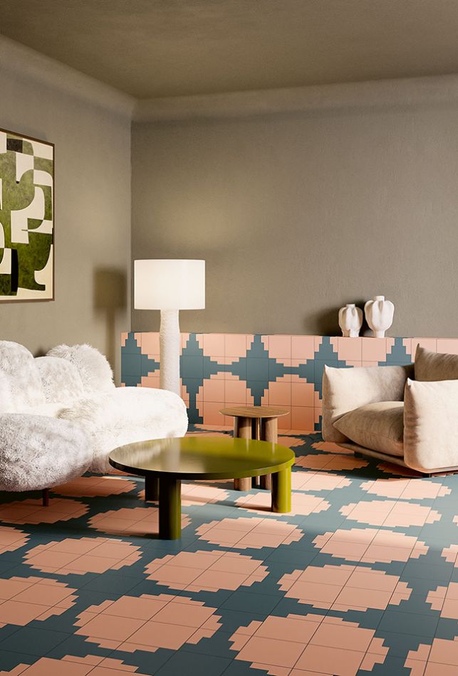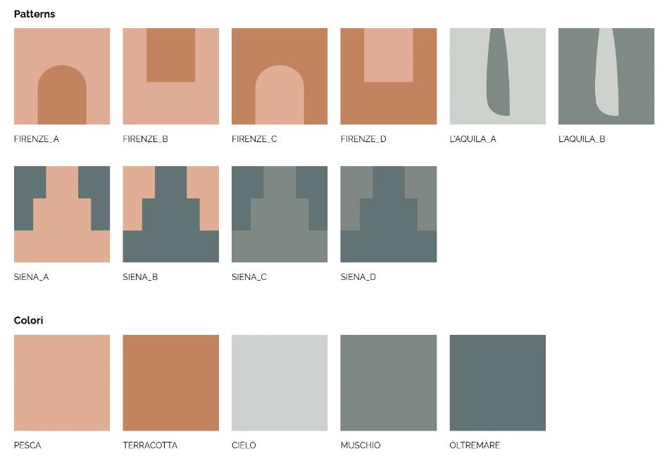 Paleta obuhvata dekorativne motive (Firenze A-D, L’Aquila A-B, Siena A-D) i jednobojne cementne fondove Oltremare, Cielo, Muschio, Pesca i Terracotta. Modularne kompozicije omogućavaju kombinovanje ton-na-ton ili kontrastnih rešenja, uz upotrebu kolorisanih fuga, čime zidovi i podovi postaju grafički pejzaži sa izraženim identitetom.