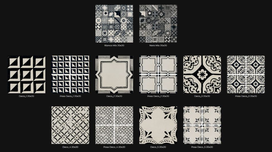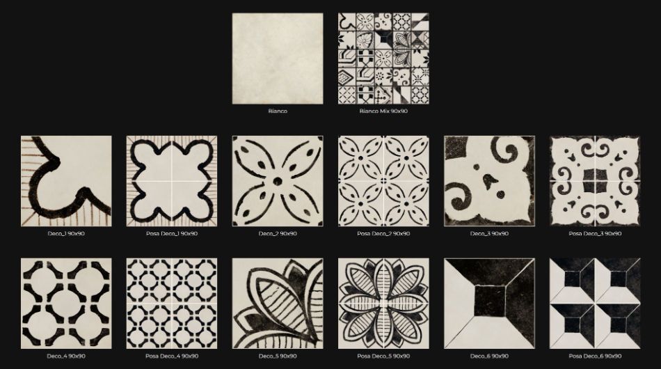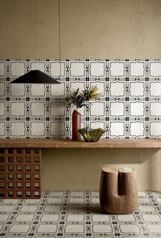 Kolekcija se razvija kroz više dekorativnih varijanti i mix kombinacija sa bogatim geometrijskim i ornamentalnim motivima. Patchwork pristup omogućava kreiranje unikatnih površina ili ponavljanje šablona za urednije kompozicije, pružajući veliku slobodu u dizajnu prostora.