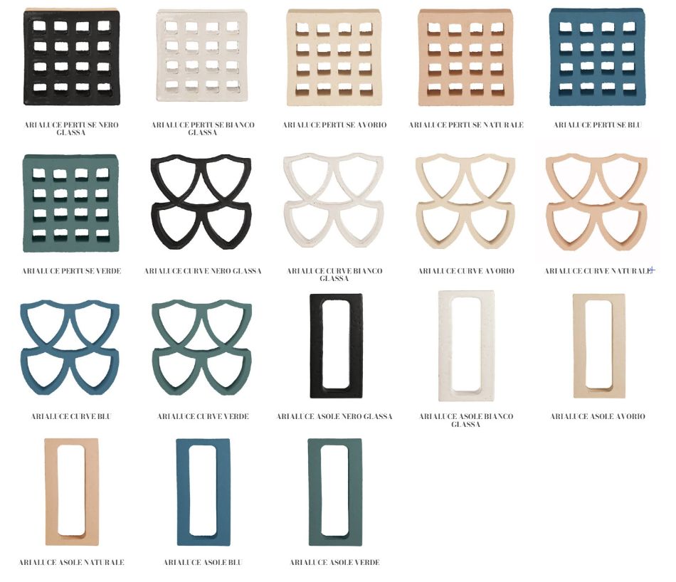 Arialuce kolekcija dekorativnih gelosija u terakoti predstavlja spoj tradicionalne zanatske izrade i savremenog dizajna. Sa oblicima Curve, Pertuse i Asole, ove gelosije kreiraju dinamične mrežaste strukture koje oplemenjuju enterijere i eksterijere, bilo da se radi o stambenim ili komercijalnim prostorima.