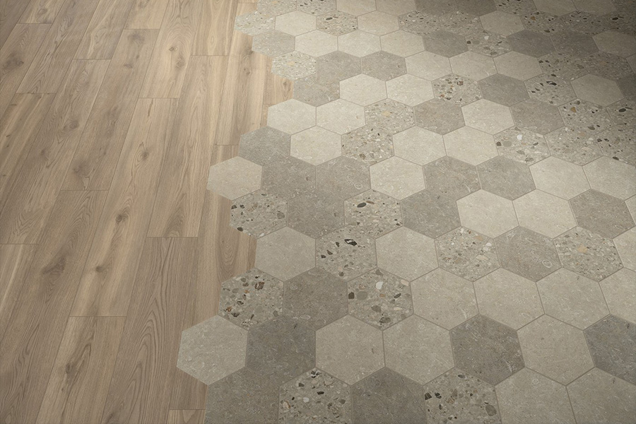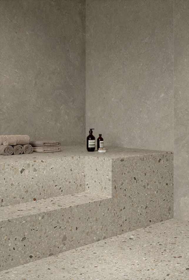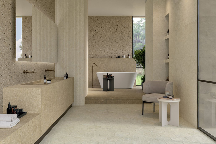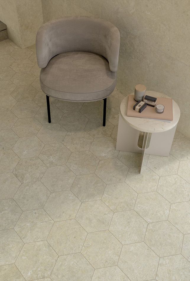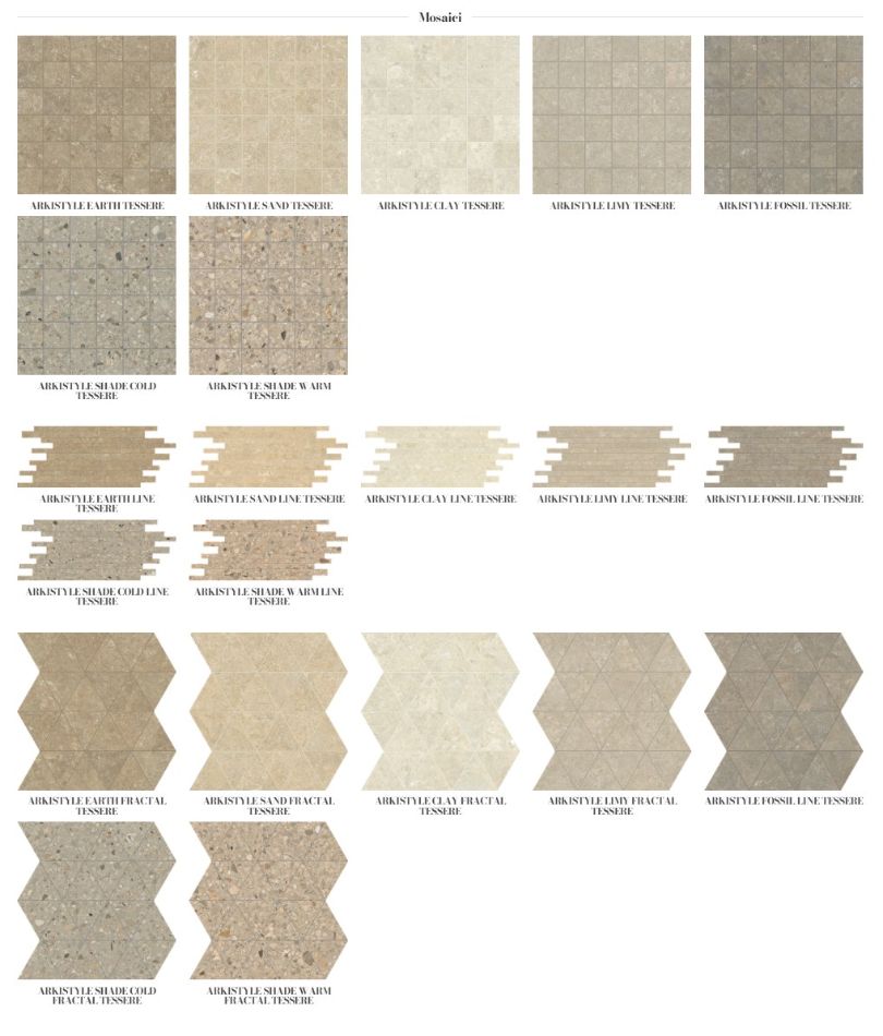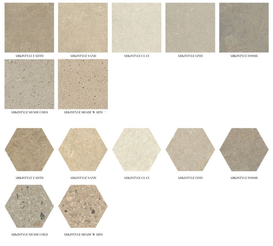 Arkistyle brenda Marca Corona predstavlja savremenu interpretaciju stone look estetike kroz spoj dve strukture: Limestone sa suptilnim inkluzijama morskih fosila i Terrazzo sa izraženim višebojnim fragmentima. Posebno se ističe Esagona 25x21,6 cm format, koji dodatno naglašava grafičku dinamiku kolekcije.