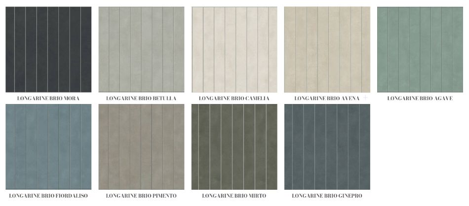 Boje kolekcije crpe inspiraciju iz prirodnih nijansi, sa mat površinom i blagim varijacijama koje podsećaju na ručno rađene premaze. Longarine Brio omogućava kreativne šeme postavljanja, uključujući zakrivljene površine velikog radijusa, uz kombinaciju sa savremenim ili rustičnim materijalima poput drveta i betona.