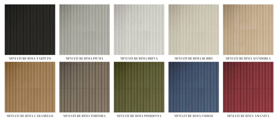 Paleta obuhvata 10 boja: Tartufo, Piuma, Brina, Burro, Mandorla, Caramello, Tortora, Posidonia, Indigo i Amanita. Brick 6x24 može se postavljati u više šema, uključujući i zakrivljene zidove, čime se otvaraju brojne mogućnosti za dekorativne niše, naglašene volumene i savremene komercijalne i rezidencijalne enterijere.