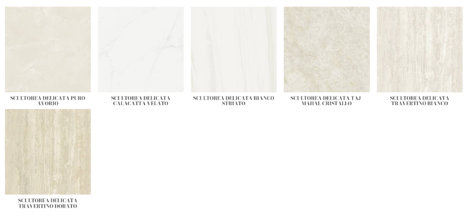 Scultorea Delicata je kolekcija vrhunskih porcelanskih pločica koja reinterpretira čiste, svetle i luksuzne nijanse prirodnog mermera poput Calacatta Velato, Bianco Striato i Taj Mahal Cristallo. Pored prepoznatljivih površina u mat i sjajno obradi, kolekcija uvodi i sofisticiranu Velvet završnu obradu, dostupnu čak i na formatima velikih dimenzija 120x278 cm.