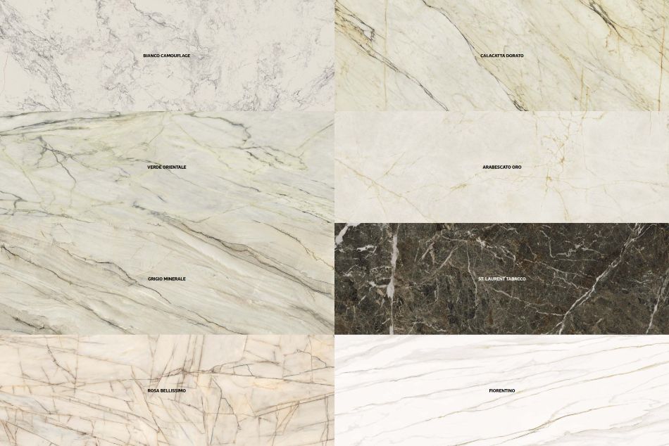 Kolekcija je dostupna u osam mermernih varijanti koje čine neutralnu, ali izražajnu paletu boja, obogaćenu suptilnim i eklektičnim akcentima. Završne obrade Naturale, Silk i Velvet dodatno naglašavaju strukturu i svetlosnu igru na površini, omogućavajući različite vizuelne interpretacije prostora i širok spektar dizajnerskih rešenja u rezidencijalnim i komercijalnim projektima.