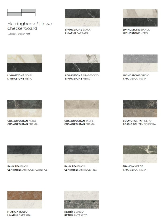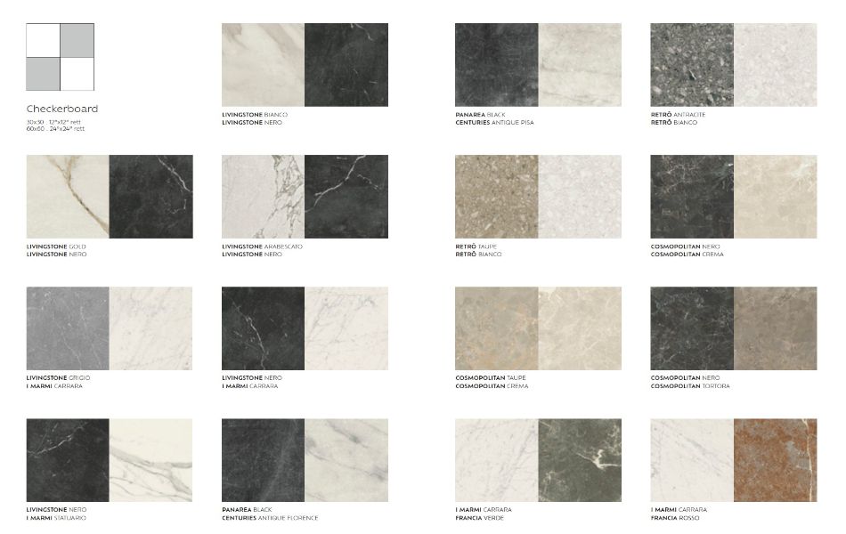 Checkerboard Inspirations je koncept kolekcija granitne keramike koji oživljava bezvremenske kompozicije kroz savremen pristup formatu, boji i ritmu polaganja. Šahovska polja, oktagoni, cassettone i herringbone šeme oblikuju raznovrsne geometrijske površine sa izraženim dekorativnim karakterom, oslonjene na estetiku mermera i kamena.